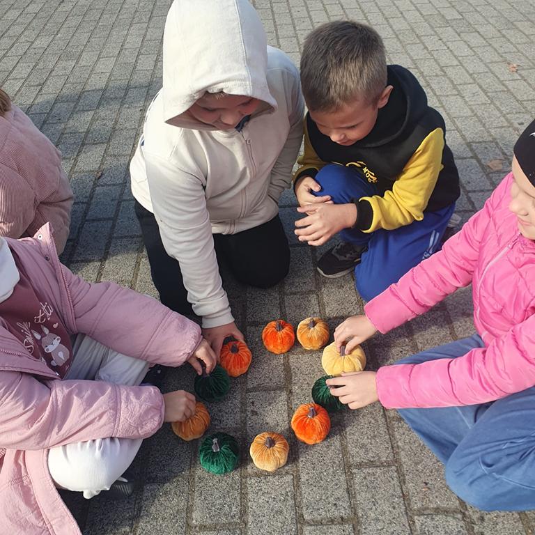 Zebrane w terenie patyki uczniowie układali w kolejności od najkrótszego do najdłuższego, a następnie je mierzyli. Z kasztanów i miniaturowych dyń powstawały cyfry, a także rytmy i sekwencje tworzone z liści, kamieni, kasztanów i dyń (np. liść–kasztan–dynia–liść).