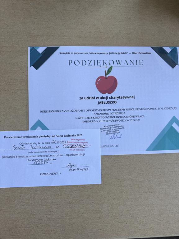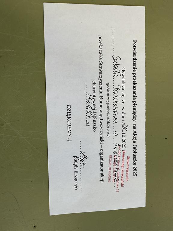 W dniach 22–24 października nasza szkoła aktywnie uczestniczyła w charytatywnej akcji „Jabłuszko”. Dzięki zaangażowaniu i wsparciu całej społeczności szkolnej udało nam się zebrać 1126,84 zł.