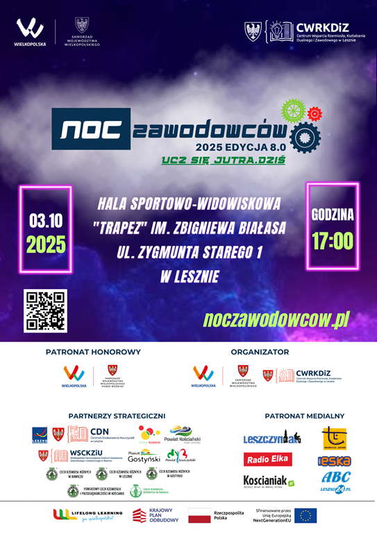 W imieniu organizatora: Centrum Wsparcia Rzemiosła Kształcenia Dualnego i Zawodowego w Lesznie serdecznie zapraszamy uczniów klas VIII i VII szkół podstawowych oraz ich rodziców na wydarzenie: Noc Zawodowców, które odbędzie się 03.10.2025 r. w godzinach 17:00 - 21:00, w hali sportowo-widowiskowej TRAPEZ w Lesznie.
