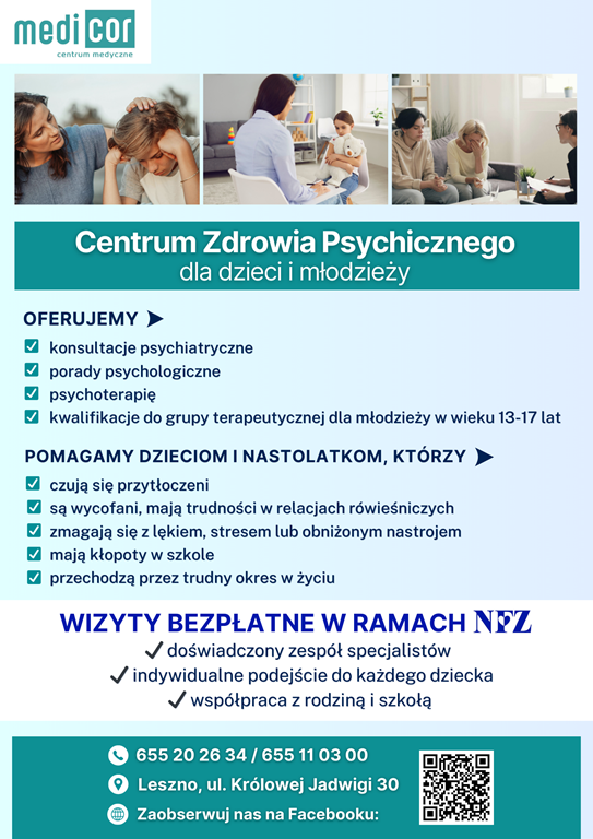 Uprzejmie informujemy o działalności Centrum Zdrowia Psychicznego dla Dzieci i Młodzieży w Lesznie, które oferuje bezpłatną pomoc dzieciom i młodzieży w ramach świadczeń finansowanych przez NFZ (szybkie terminy).