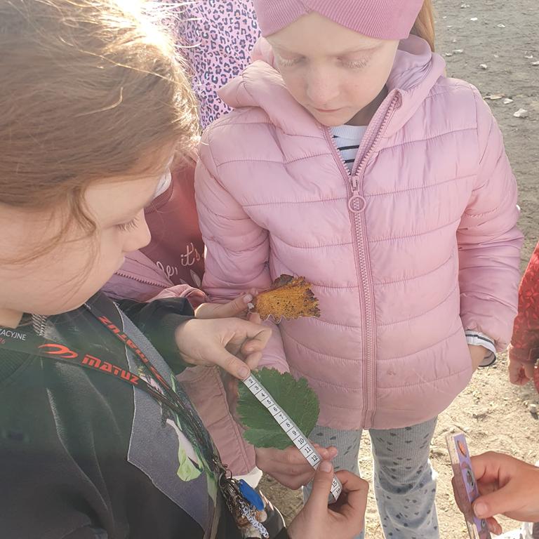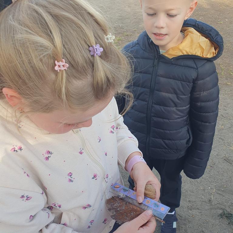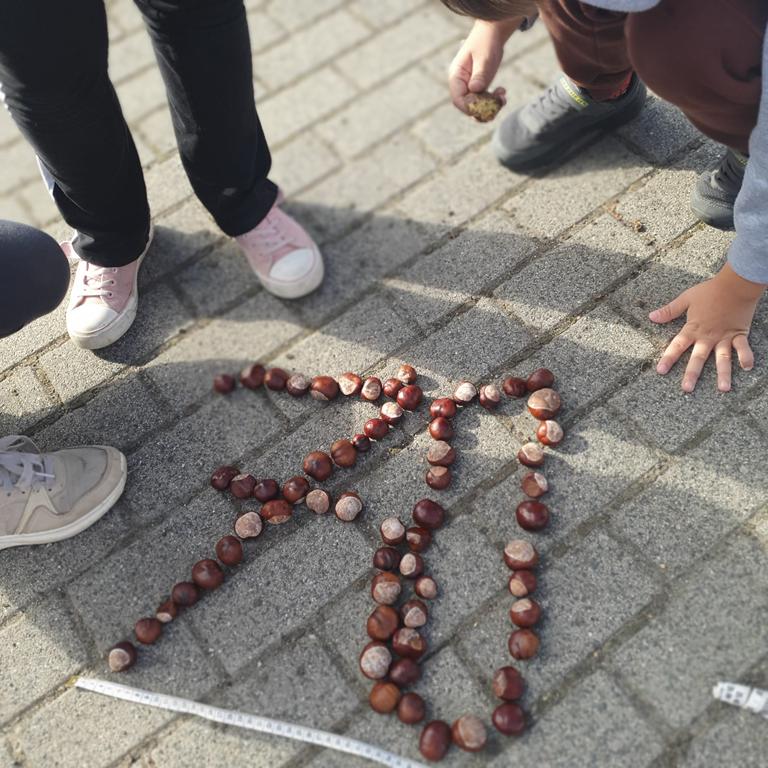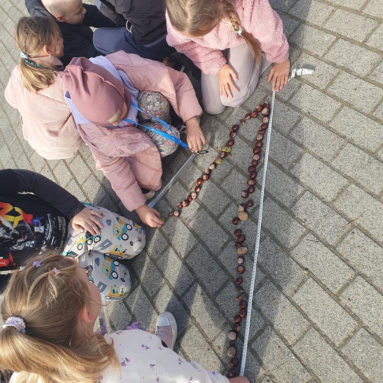 Zebrane w terenie patyki uczniowie układali w kolejności od najkrótszego do najdłuższego, a następnie je mierzyli. Z kasztanów i miniaturowych dyń powstawały cyfry, a także rytmy i sekwencje tworzone z liści, kamieni, kasztanów i dyń (np. liść–kasztan–dynia–liść).