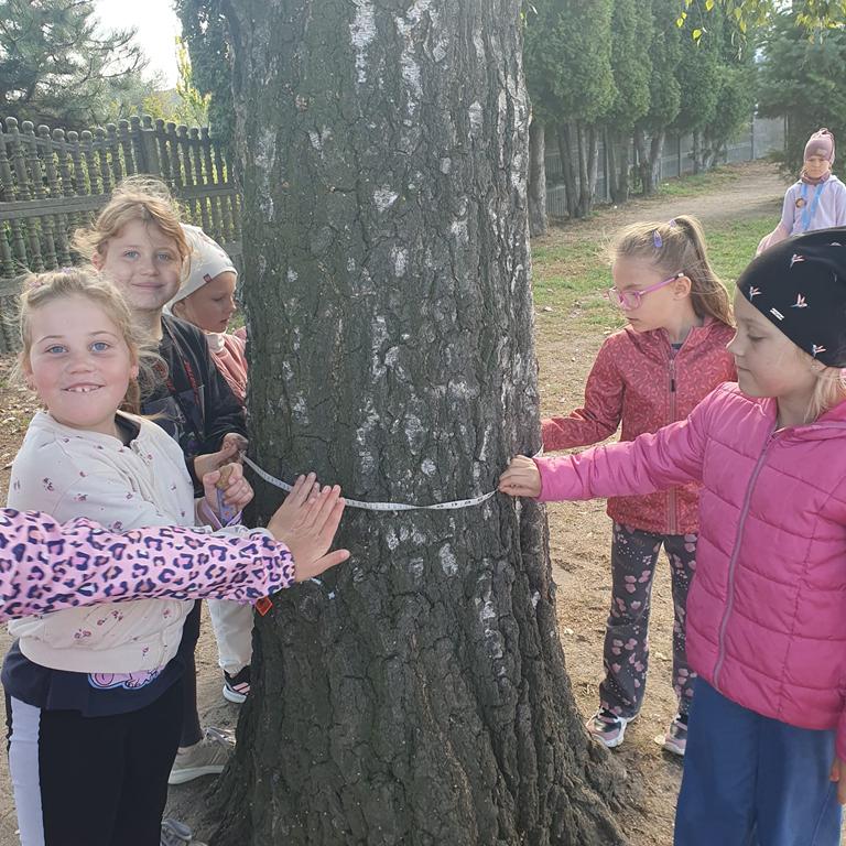 Uczniowie klasy 1b w ramach programu Kreatywna matematyka wyszli na zajęcia w plener. Dzieci mierzyły różne elementy otoczenia – patyki, ławki czy drzewa – korzystając z linijki, miary krawieckiej i metra. Porównywały wyniki, sprawdzając, co jest dłuższe, a co krótsze, oraz zgadywały długość przedmiotów, by potem zweryfikować swoje przypuszczenia.