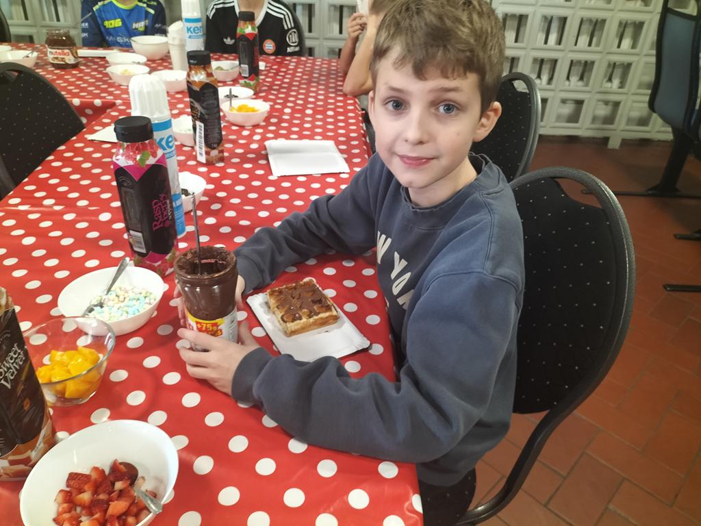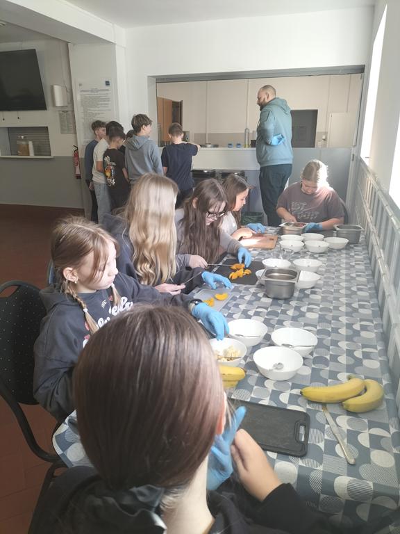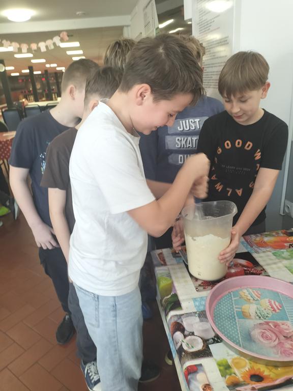5 marca uczniowie klasy 5b wybrali się na wyjątkową wycieczkę, by świętować Dzień Kobiet. Pierwsza część wyjazdu upłynęła pod znakiem łakoci. To nie była jednak zwykła wizyta w kawiarni – uczniowie zamienili się w szefów kuchni! Podczas warsztatów kulinarnych piątoklasiści samodzielnie nakrywali do stołu, przygotowali i wypiekali ciasto na gofry, kroili świeże owoce i dobierali ulubione dodatki.