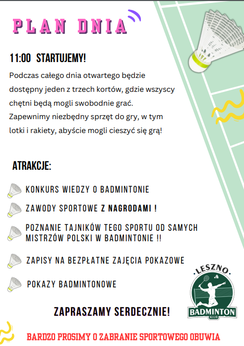 28 kwietnia odbędą się w Lesznie Dni Otwarte Badmintona. Zarówno dzieci jak i dorośli, którzy wezmą udział w wydarzeniu będą mieli w tym dniu możliwość skorzystania z promocji i nieodpłatnego zapisania się na zajęcia badmintona wraz z trenerem. Szczegóły na plakatach.