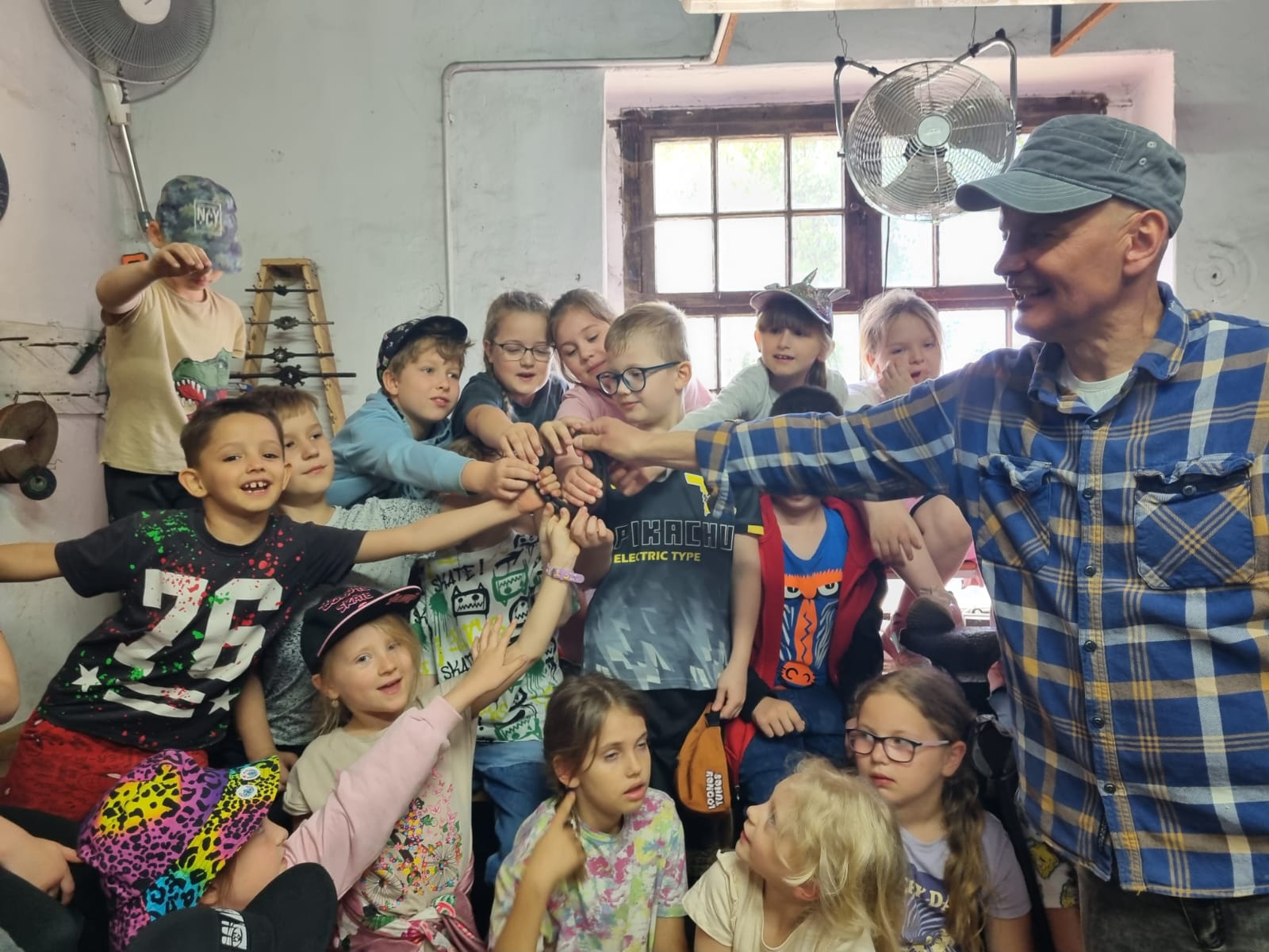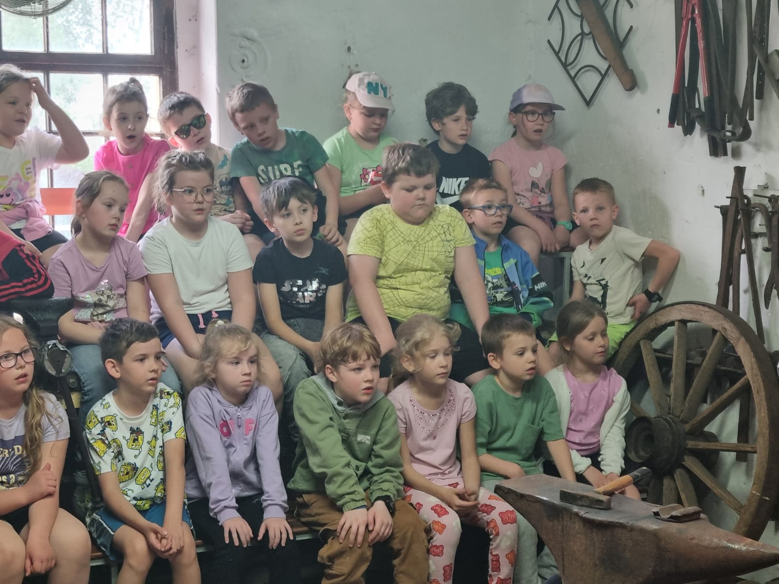 " Stary Kowal" przygotował dla dzieci mnóstwo atrakcji, między innymi: pokaz wykuwania podkowy, przejazd traktorem na przyczepie, pokaz wyrabiania masła. Dzieci spróbowały także pysznych wypieków mamy " Kowala" - słodkich rogalików, a potem bawiły się z wiejskimi zwierzętami na prawdziwym, wiejskim podwórku. Na koniec odbyło się ognisko.