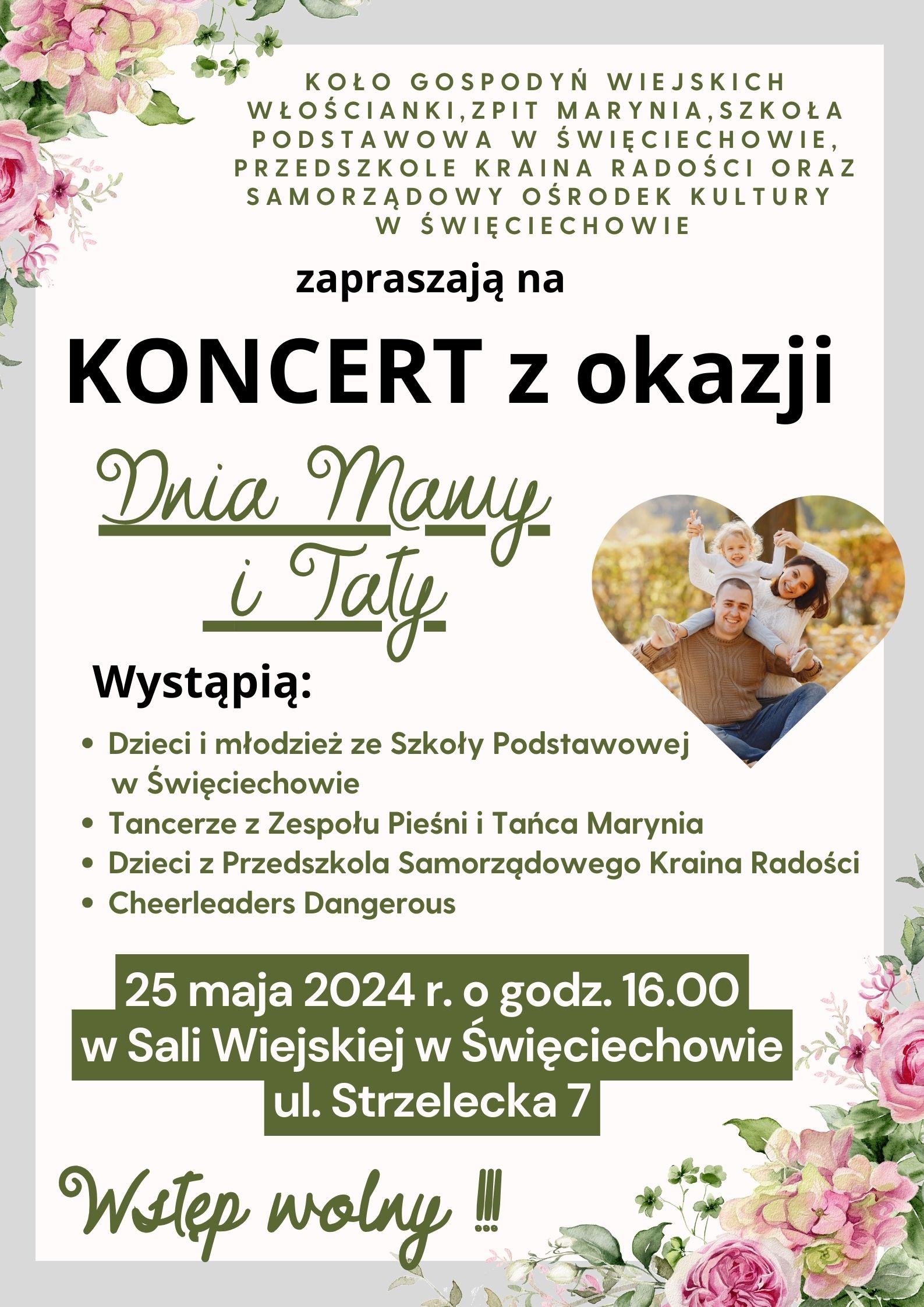 Serdecznie zapraszamy na Gminny Dzień Mamy i Taty, który odbędzie się w najbliższą sobotę w sali wiejskiej w Święciechowie o godzinie 16.00. W wydarzeniu wezmą udział także nasi uczniowie. Zaprezentują nagrodzone na Ogólnopolskim Przeglądzie Twórczości Teatralnej Maska 2024 przedstawienia: teatrzyk "Łojery" pokaże "Księżniczkę na ziarnku grochu", a "Powsinoga" spektakl pt. "Podaj rękę". Dzieci z klasy 2a zaśpiewają piosenkę pt. "Drodzy Rodzice". Szczegóły na plakacie. Zapraszamy!