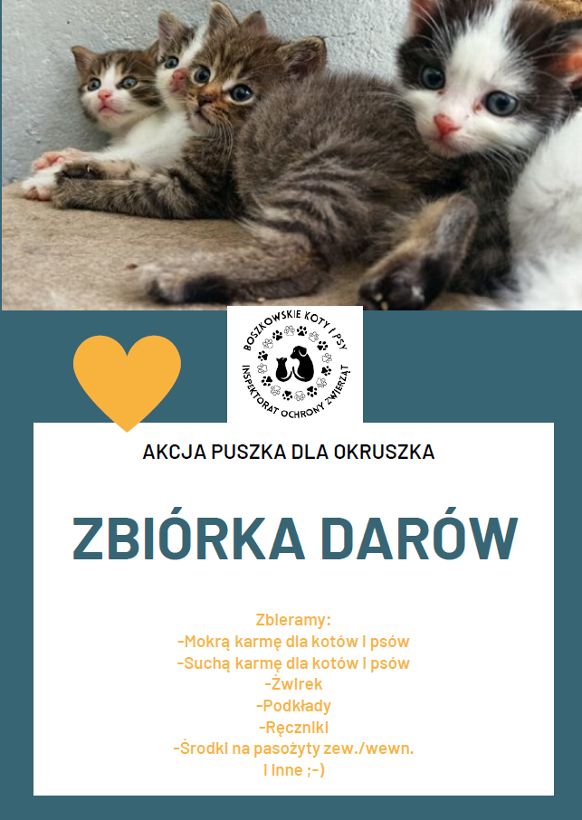 otrzymaliśmy rozpaczliwą prośbę o pomoc od Stowarzyszenia Boszkowskie Koty i Psy, które znalazło się w bardzo trudnym położeniu. Przytulisko potrzebuje suchą i mokrą karmę dla kotów i psów, żwirek, zabawki dla zwierząt, transportery, ręczniki oraz preparaty na pasożyty wewnętrzne i zewnętrzne.