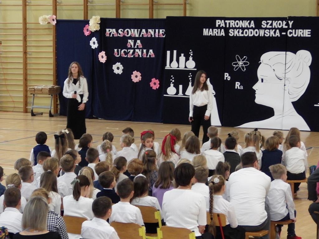 Po zakończeniu części artystycznej miała miejsce wyjątkowa ceremonia – pasowanie uczniów klas pierwszych na pełnoprawnych członków społeczności szkolnej. W podniosłej atmosferze uczniowie pierwszych klas ślubowali, że będą starać się podążać śladami Patronki Szkoły, kierując się jej wartościami, determinacją oraz niezachwianym dążeniem do wiedzy i odkrywania prawdy. Ceremonii przewodniczył Dyrektor Szkoły, który pasował każdego z uczniów. Pierwszoklasiści przygotowali specjalne występy na tę okazję – recytowali wiersze oraz tańczyli.