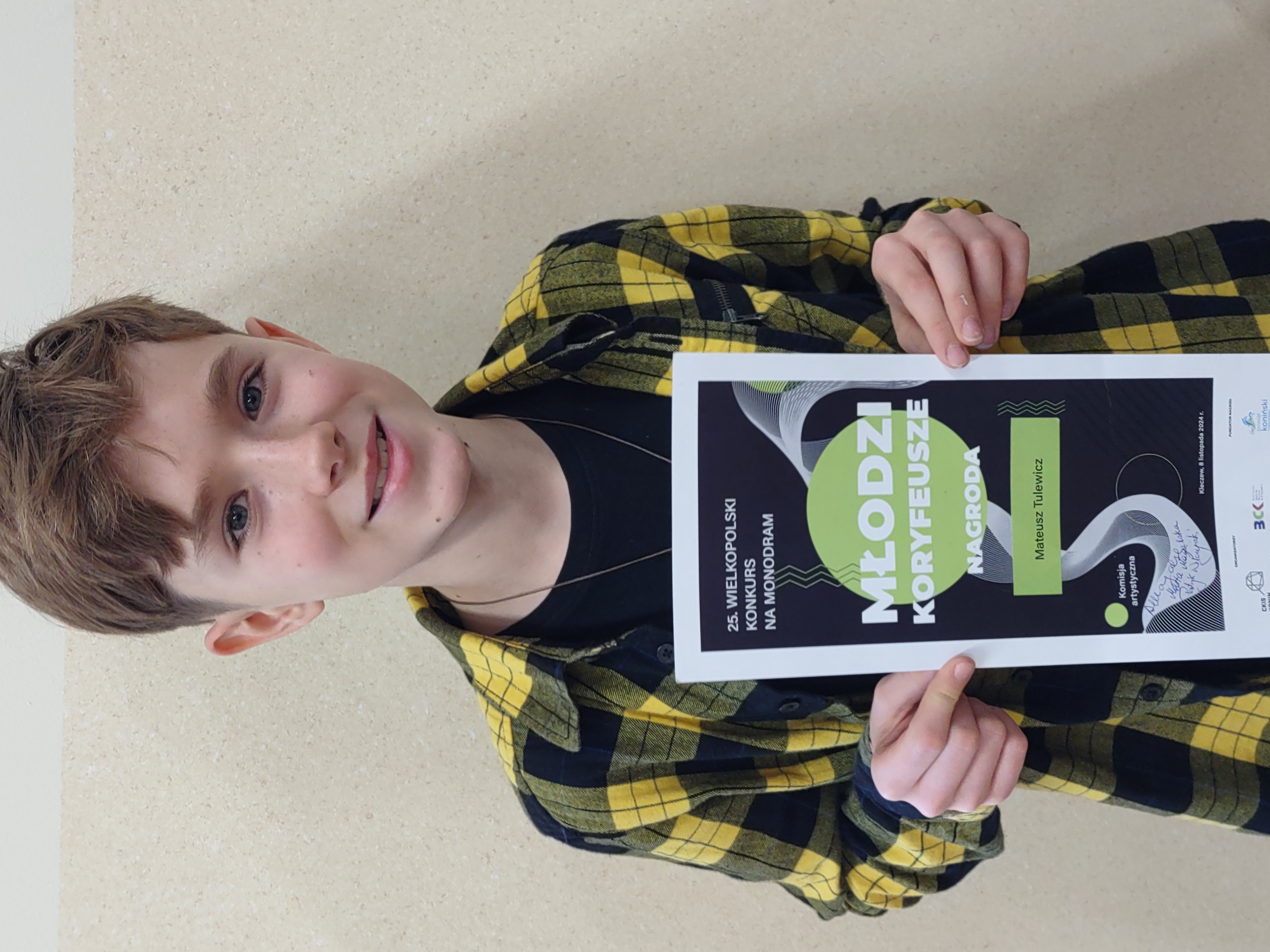 Mateusz Tulewicz, uczeń klasy 6a, wziął udział w 25. Wielkopolskim Konkursie na Monodram “Młodzi Koryfeusze”. Monodram to utwór sceniczy, w którym występuje tylko jeden aktor, więc Mateusz nie miał łatwego zadania. Musiał powalczyć o uwagę widza wykorzystując słowo, ruch, gest oraz rekwizyty, a na scenie był sam. Mimo że to jego debiut w tej formie teatralnej, chłopiec wywiązał się z zadania wyśmienicie - zdobył jedną z czerech równorzędnych nagród w swojej kategorii wiekowej.
