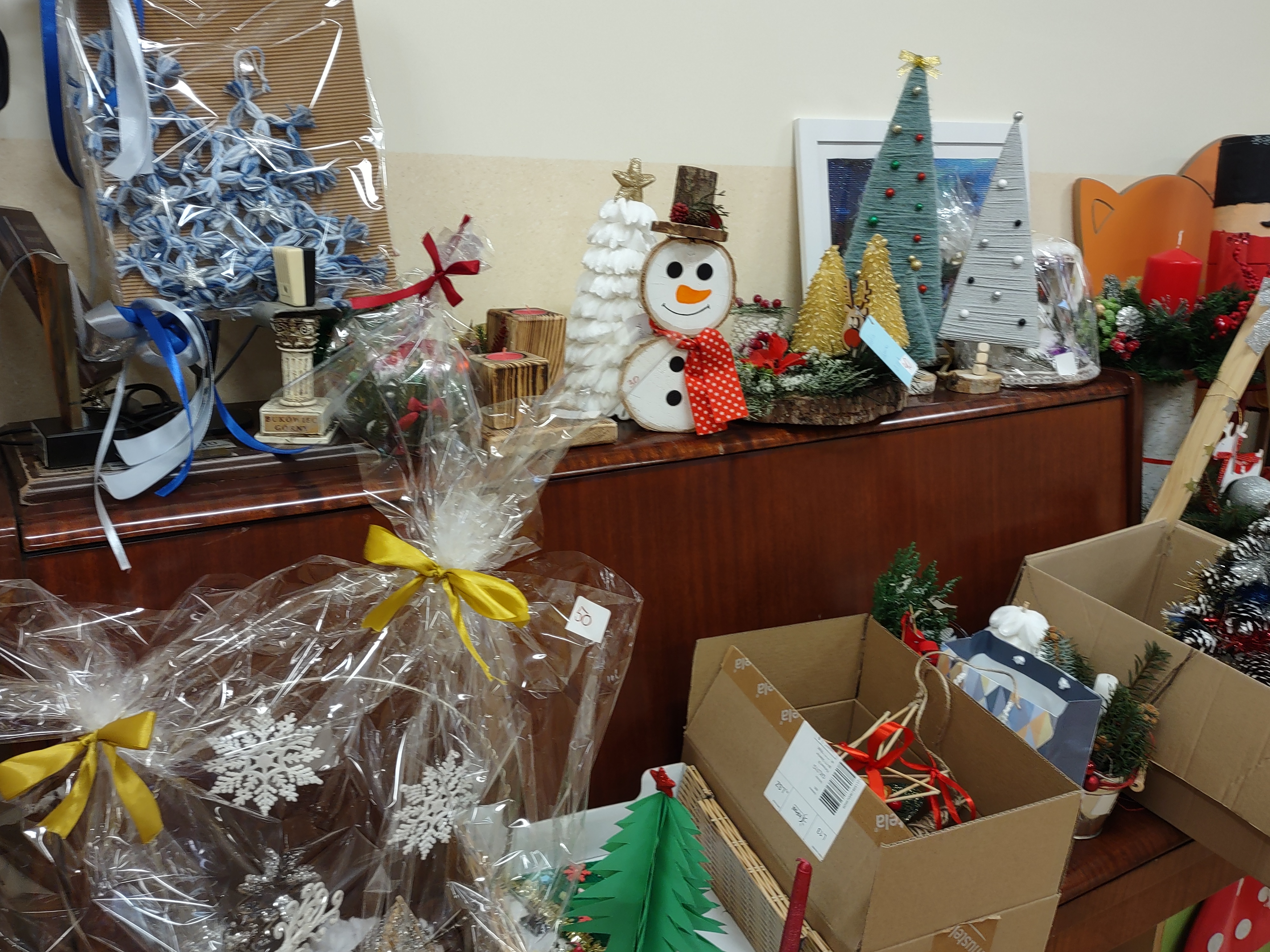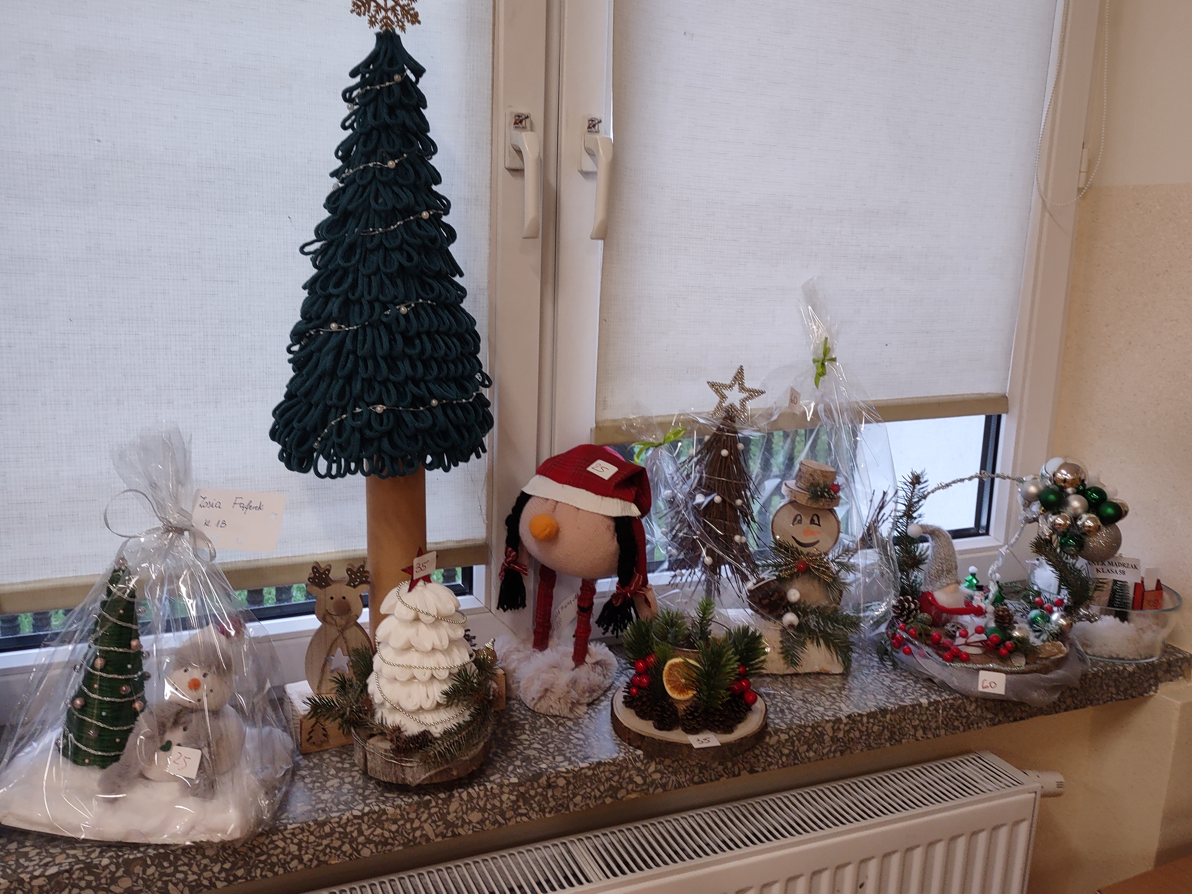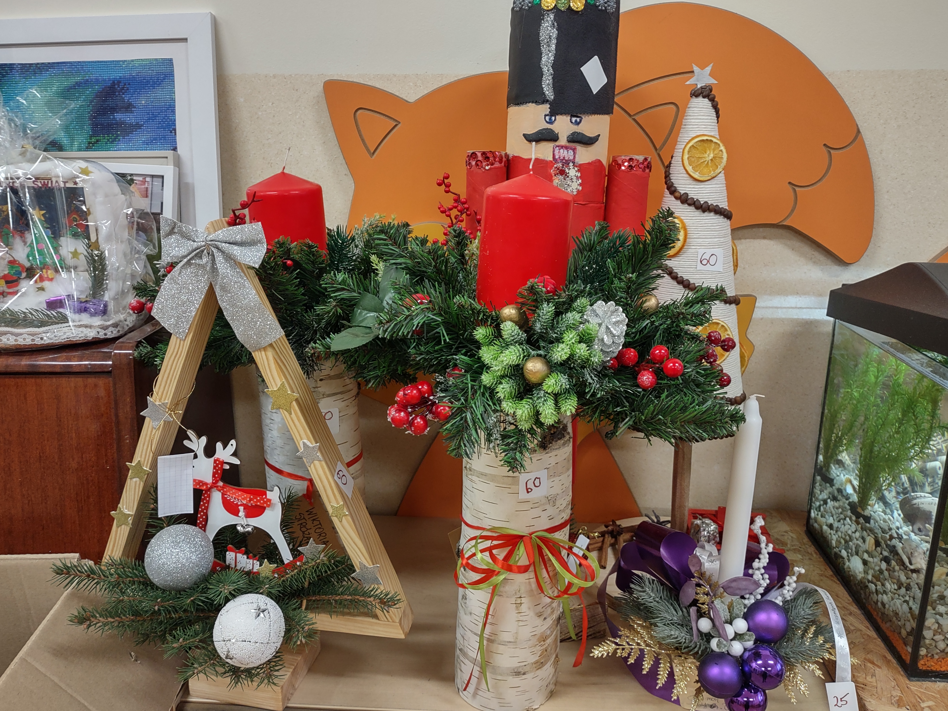 Na kupno czekają stroiki, świeczniki, krasnale, figurki dziadków do orzechów, choinki, bombki i wiele, wiele innych przepięknych ozdób. Stoiska będą czynne na każdej przerwie od 8.30 do 12.30. Dodatkowo, w czasie dużej przerwy, czyli od 12.10 do 12.30 zapraszamy w dniach 6, 9, 10, 11 grudnia wszystkich chętnych rodziców, którzy chcieliby zakupić świąteczne dekoracje (prosimy o wejście drzwiami od szkolnego dziedzińca i kierowanie się pod salę gimnastyczną). Poniżej prezentujemy zdjęcia niektórych ozdób, jakie znajdą się od 6 grudnia w sprzedaży. Wszystkie dekoracje zostały wykonane przez dzieci i rodziców na Rodzinny Konkurs Świąteczny.