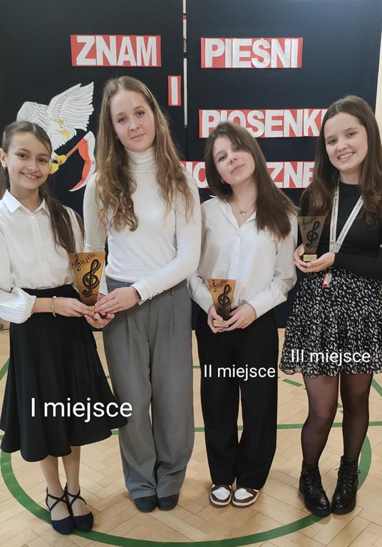 W miniony wtorek, 26 listopada, już po raz siódmy odbył się w naszej szkole Konkurs Pieśni i Piosenki Patriotycznej. Przesłuchania przebiegały w dwóch kategoriach wiekowych: klasy I - IV oraz klasy V- VIII. Komisja w składzie: Bogusława Kuźniak i Joanna Grzeszczyk oceniając dobór repertuaru, jego orginalność, dykcję, walory wokalne i strój uczestnika przyznała statuetki:
